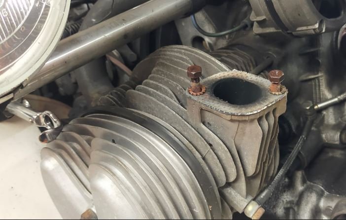 Comme j'ai eu du mal à sortir les goujons de la vieille culasse, j'ai monté la pipe d'échappement avec des vis.