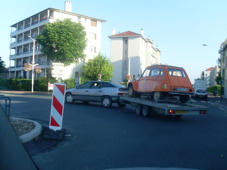 Ce matin petit tour en XM "PeuTroën" :vomi: , mais c'était pour la bonne cause, car désormais la Dyane de Grand-fi est dans le jardin du malfaisant des TCL !!!