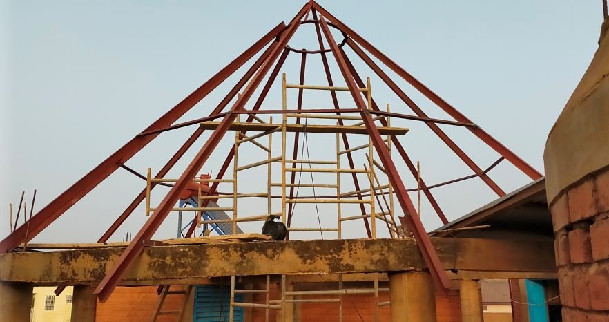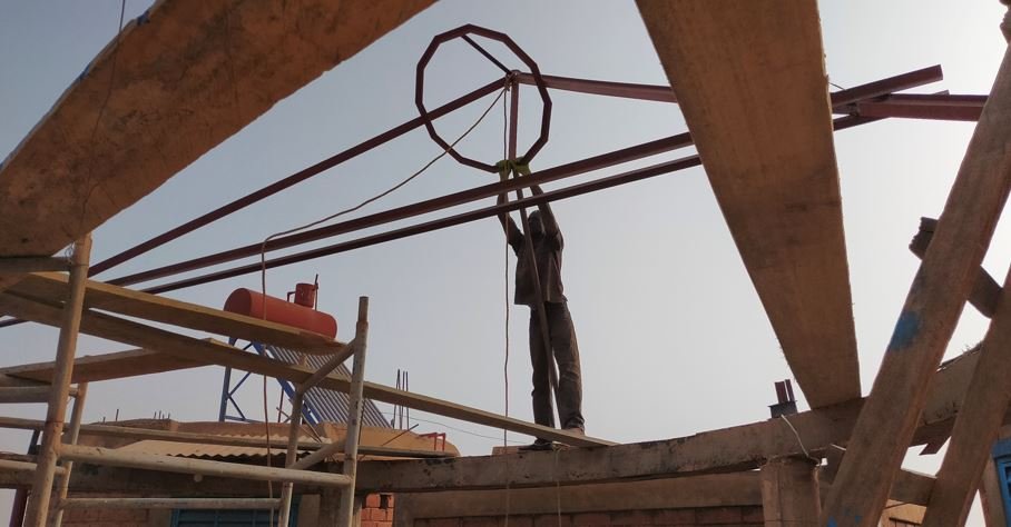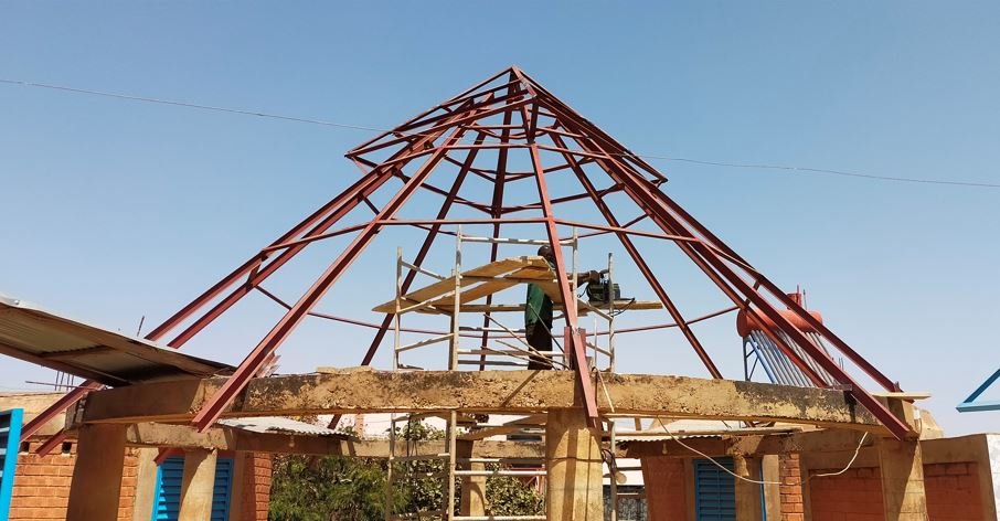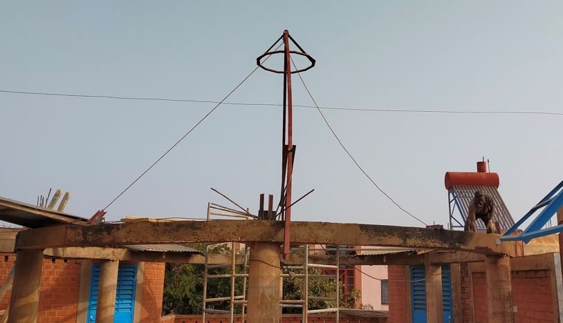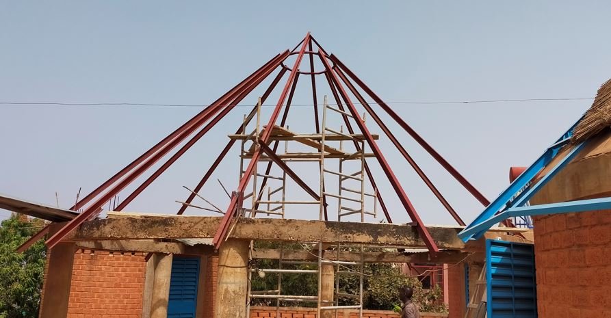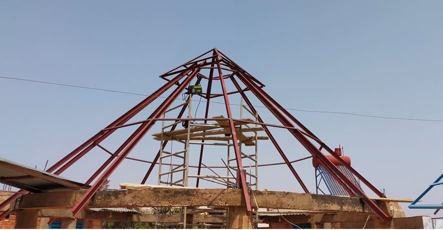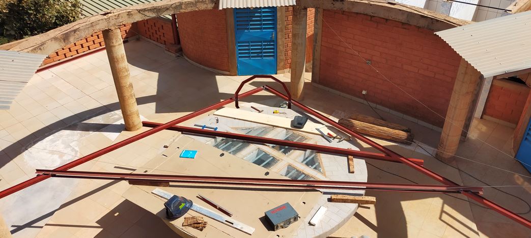 Ce matin, réalisation du chapeau carré qui permettra d'avoir une ventilation du haut de la paillotte.