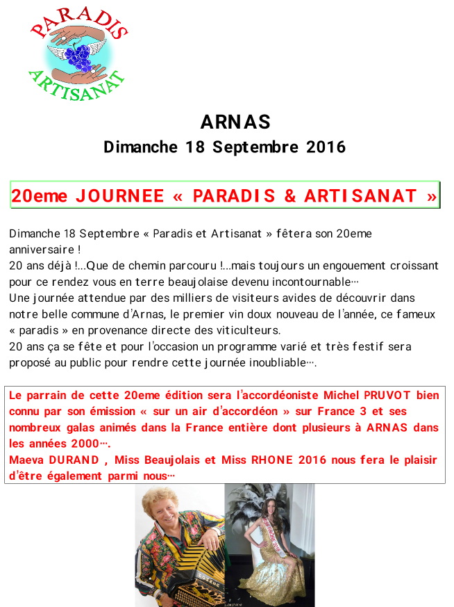 Le 18 Septembre prochain, le Comité Interclasses d'ARNAS organise le 20eme anniversaire de sa journée "Paradis et Artisanat", une manifestation dédiée à la dégustation du vin doux nouveau, à la gastronomie, à l'artisanat, aux vieux métiers et aux véhicules anciens ou d'exception....