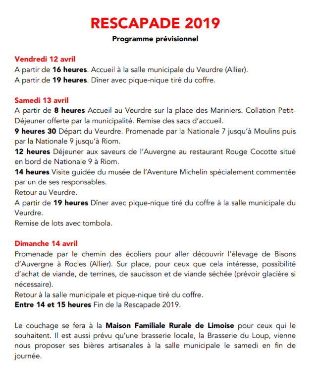 Nous vous proposons de participer à la première édition de La Rescapade, une sortie organisée dans l'esprit 100 % collection et état d'origine, réservée aux 2 CV 4, 2 CV 6, 2 CV AZU 250 et 2 CV AKS 400 dans leur jus ou restaurées. Cette sortie de printemps se déroulera le 13 et 14 avril prochains et comportera, entre autres, une grande promenade sur le tracée historique de la Nationale 7 et de la Nationale 9 depuis le sud de Nevers jusqu'à Clermont-Ferrand.