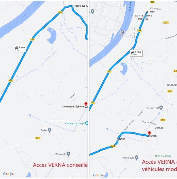 En venant de Crémieu ou de Pont de Cheruy , ne pas prendre la direction VERNA, continuer sur la D65, puis à droite sur la route des grandes terres puis encore à droite chemin de la Gaulle direction Bourcieu puis Verna.