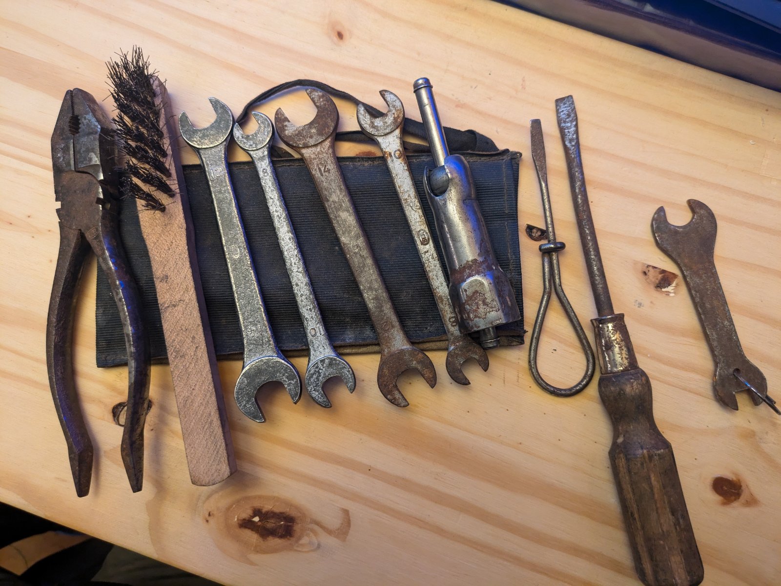Les clefs ainsi que celle à bougies sont de l'outillage fournit à l'origine d'époque dans l'étui en toile de capote. La pince, les tourne vis, la brosse et la clef plates avec l'anneau je ne sais pas. Celui avec le manche en bois est trop long pour la pochette.